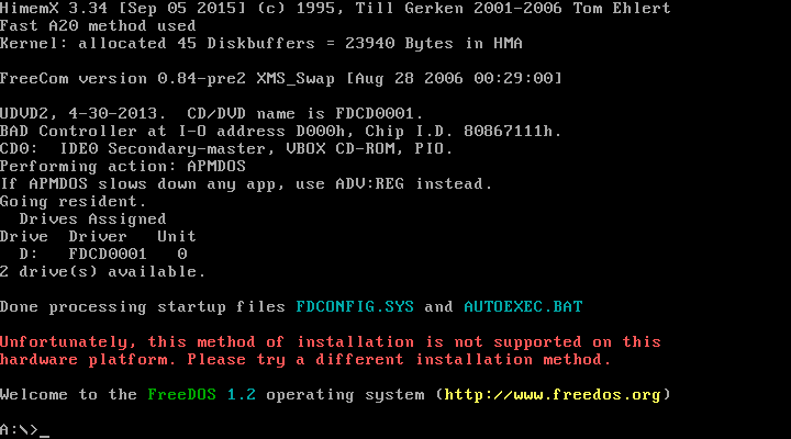 Frankly, I could not understand whether this bug is in FreeDOS or in VBox, because same FreeDOS boots in Vmware without any problem but on the other hand, it is announced in the bug ticket, that this bug will be solved in FreeDOS v1.3*. This problem has two different solutions: (1) booting the VM with FD12LGCY.iso instead of FD12CD.iso or (2) appending "raw" to the kernel parameters. Although I got a warning while booting legacy iso, I had no problem with the installation. The warning was: "Unfortunately, this method of installation is not supported on this hardware platform. Please try a different installation method." (screenshot above). I did not encounter any warning in vmware. Despite the above warning, I partitioned the disk first with fdisk when I landed to prompt, then rebooted the VM and started installation with setup command.